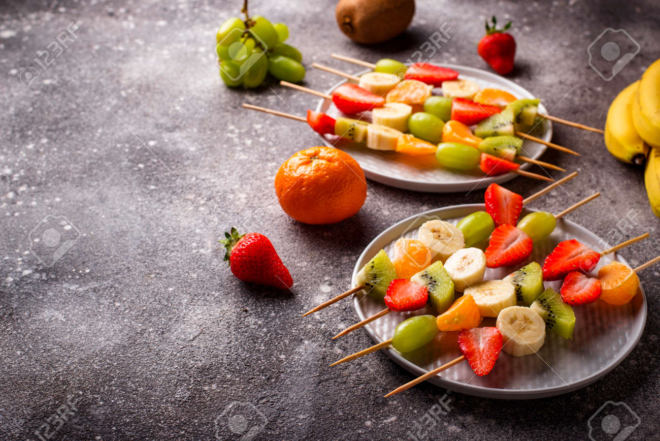 串に新鮮なフルーツ。夏のパーティーのコピースペースのためのコンセプトビュッフェの写真素材・画像素材 Image 124742515。
