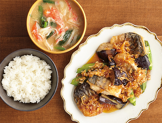 揚げさばとなす香味だれ、カニカマの彩りみそ汁eフレンズ ぱくぱく献立くん。