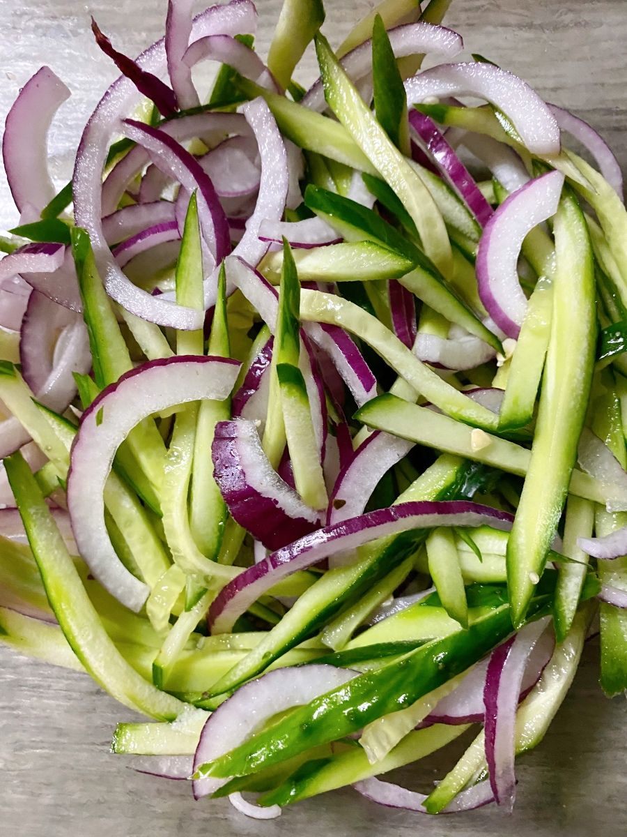 AGEレス簡単料理「ナスとミョウガのカニカマ浅漬け」AGEs-less.lifestyle.com。