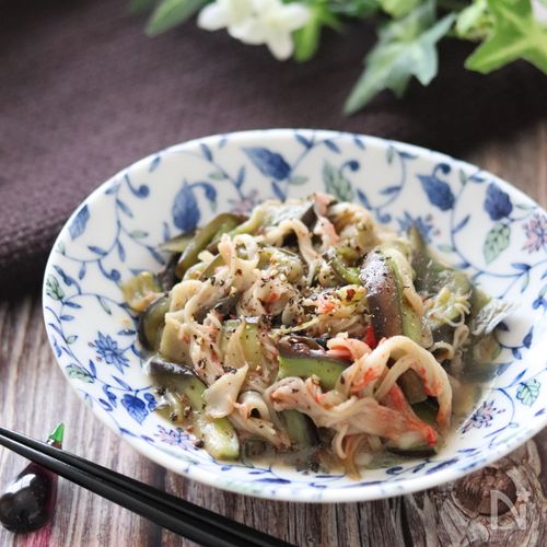 材料4つ なすとカニカマのさっぱり和風ナムル風クラシル。