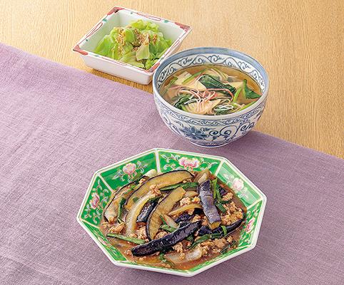 トマトとなすの炒め物の献立 主食:三つ葉とカニカマ のやみつきおむすび、汁物:たっぷり野菜の中華風春雨スープ 献立・メニュー 味の素パーク たべる楽しさを、もっと。