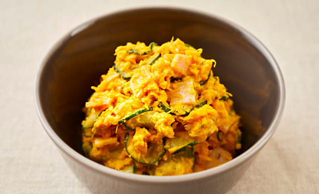 レシピ②かぼちゃサラダ 電子レンジで加熱して調味料と和えるだけ。