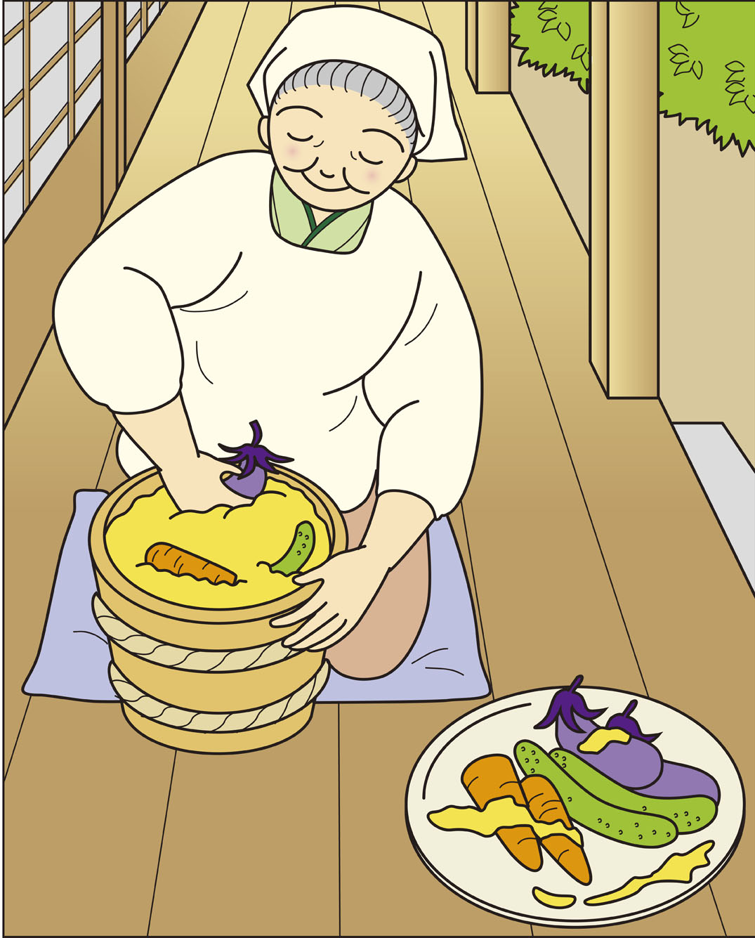 ぬか漬けを作るおばあちゃん2 モノクロ :イラスト無料。