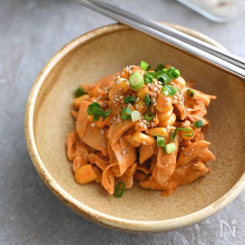 サラダチキンできゅうりとコチュジャンのピリ辛サラダ。