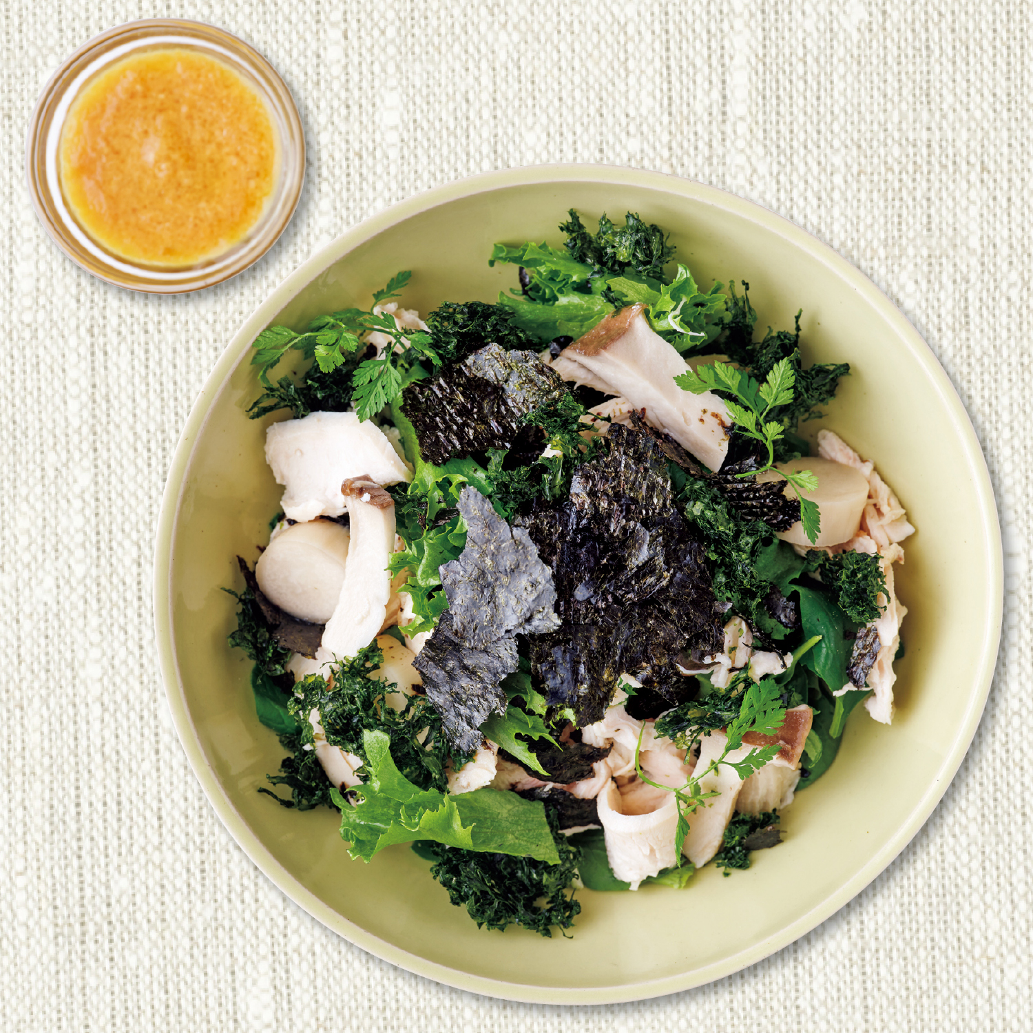 サラダチキンアレンジ のり、味噌が鶏肉にマッチ!「ワンボールで満足サラダ」レシピ 脳活「新和食」レシピ。