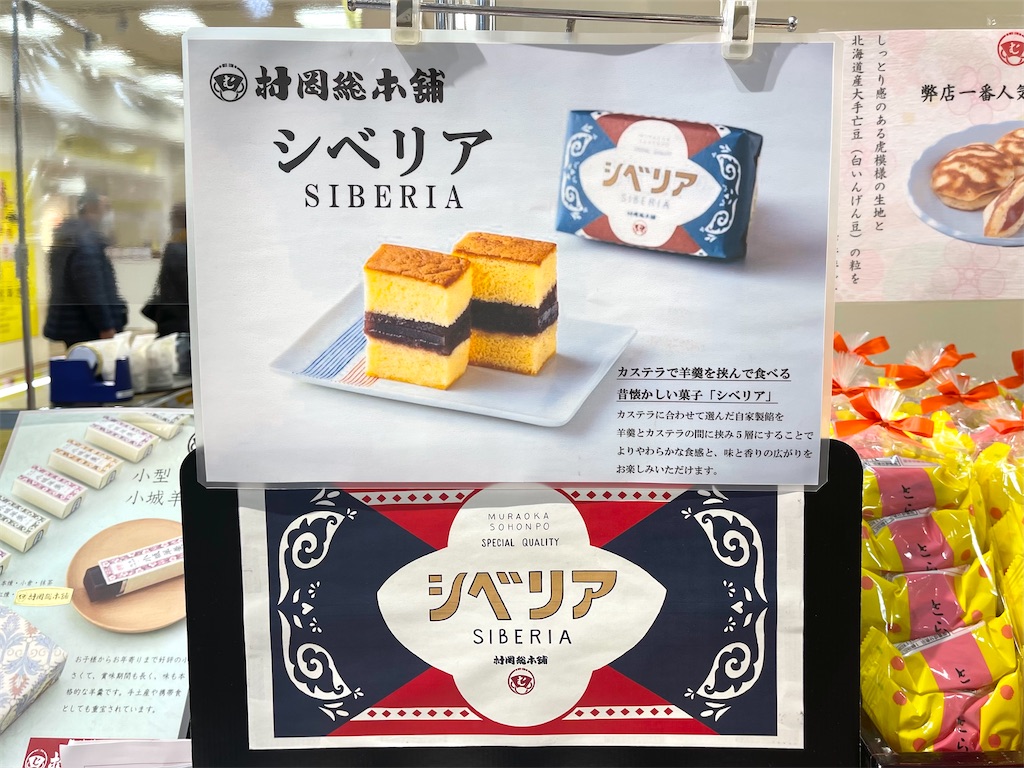スタッフおすすめ商品のご紹介です✨村岡総本舗 シベリア伝統製法の羊羹と自家製粒あんを 風味豊かなバターカステラでサンドしたシベリアです✨ 5層に サンドされているので食感もやわらか! 思わず手に取りたくなるレトロな可愛らしいパッケージデザインで、プチ。
