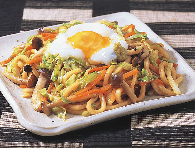 温泉卵の焼きうどんのレシピぱくぱく献立くん 料理レシピ。