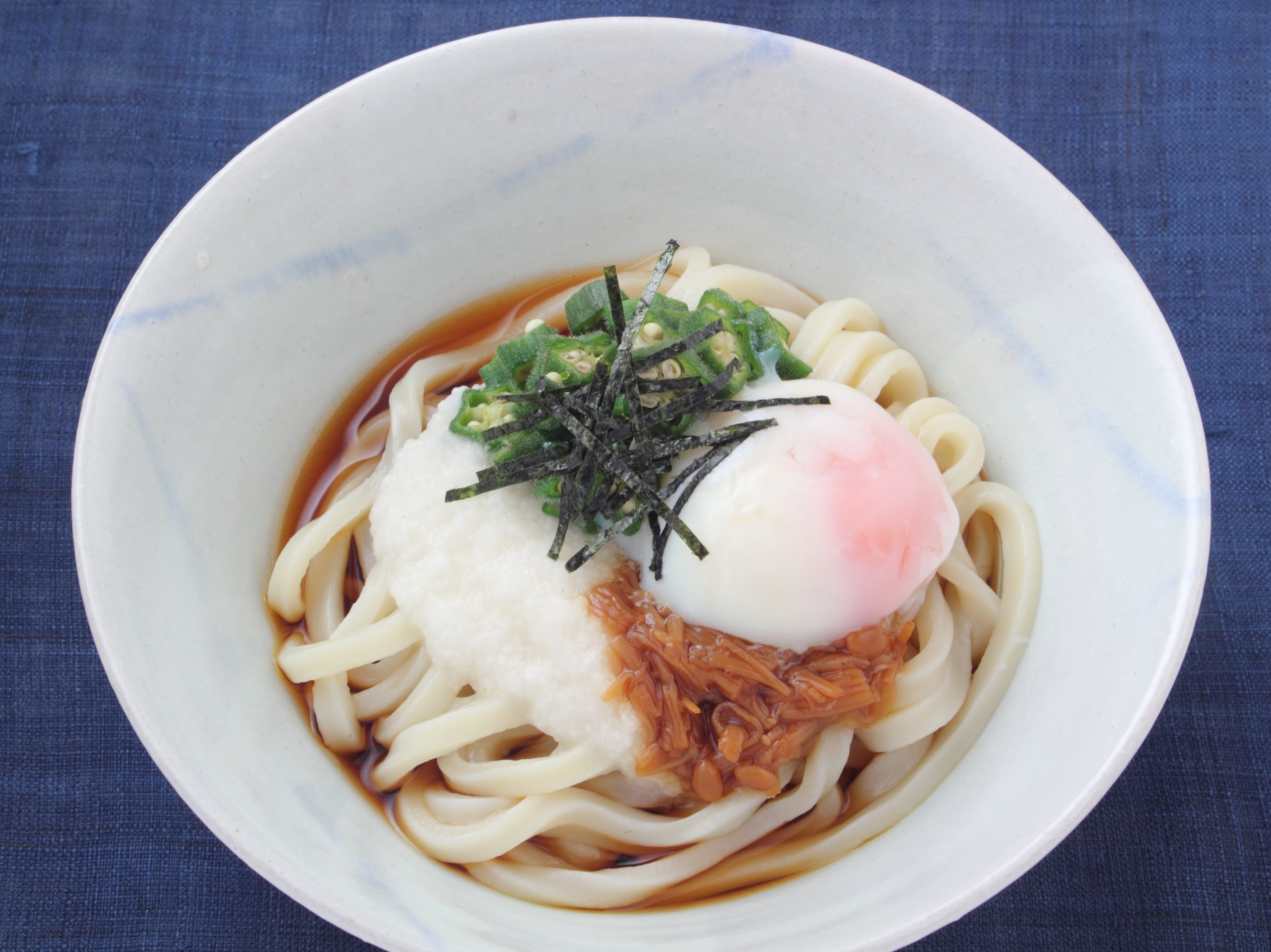めかぶと温泉卵のうどんおいしいレシピ鰹節屋・だし屋、ヤマキ。
