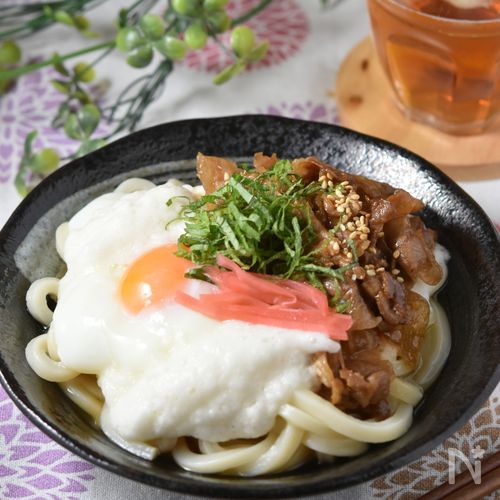 甘辛肉のとろろぶっかけうどん 温でも冷でもおいしいうどん。