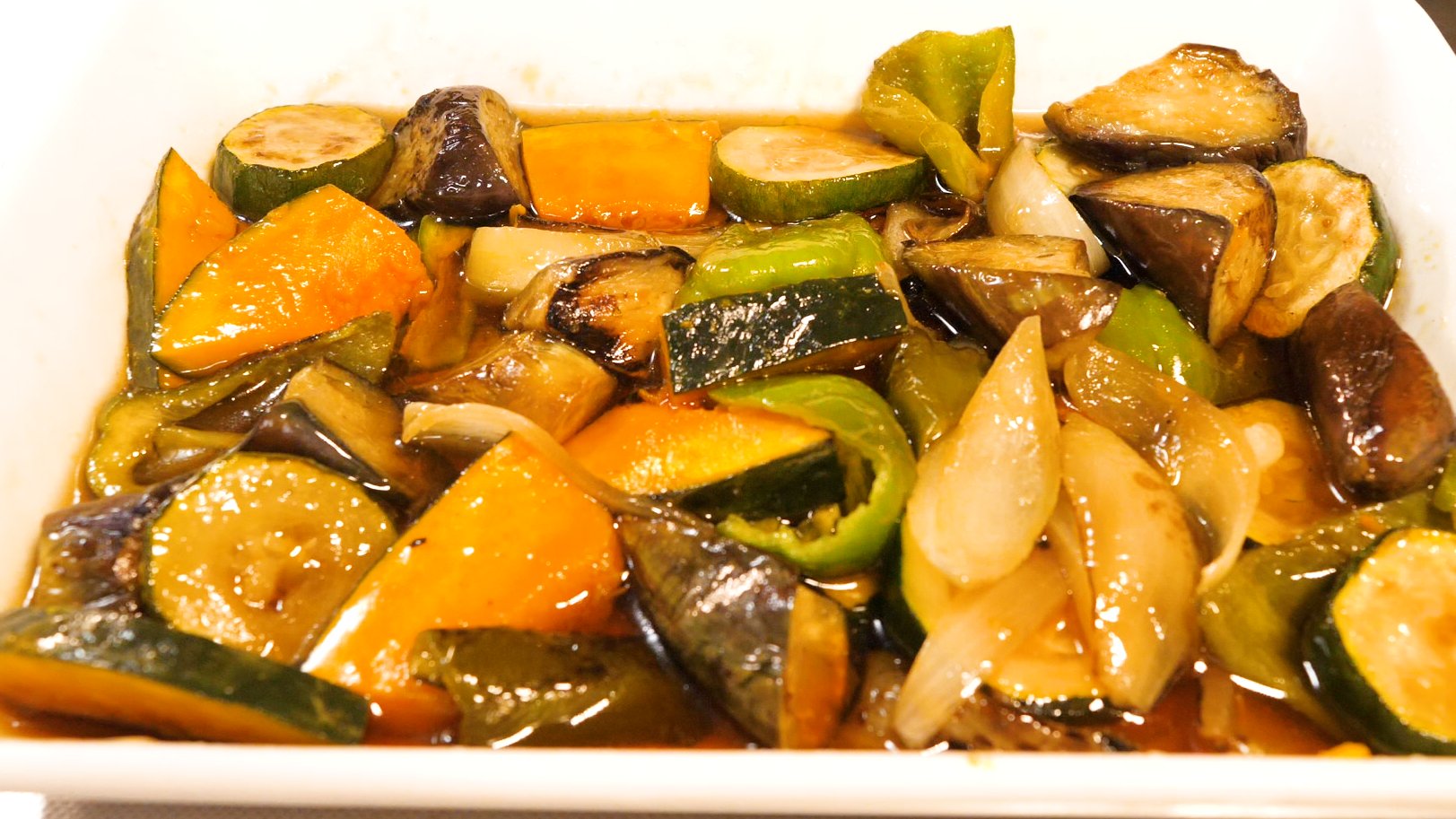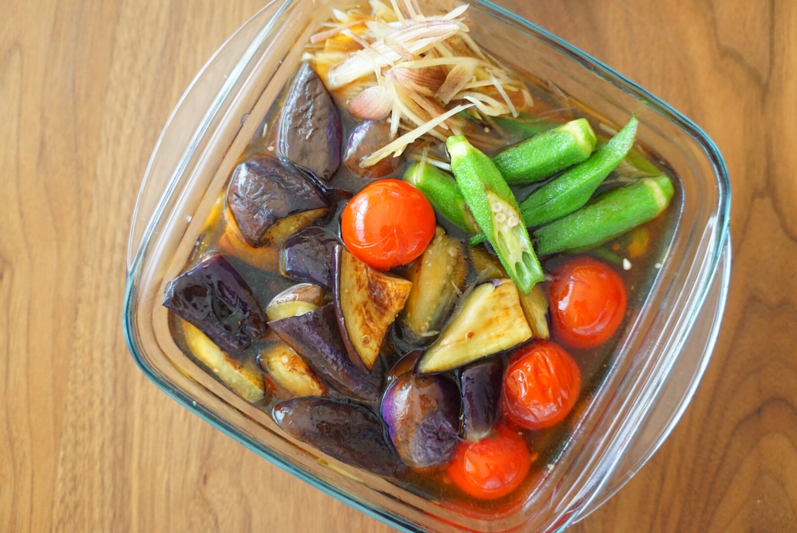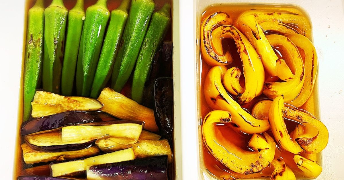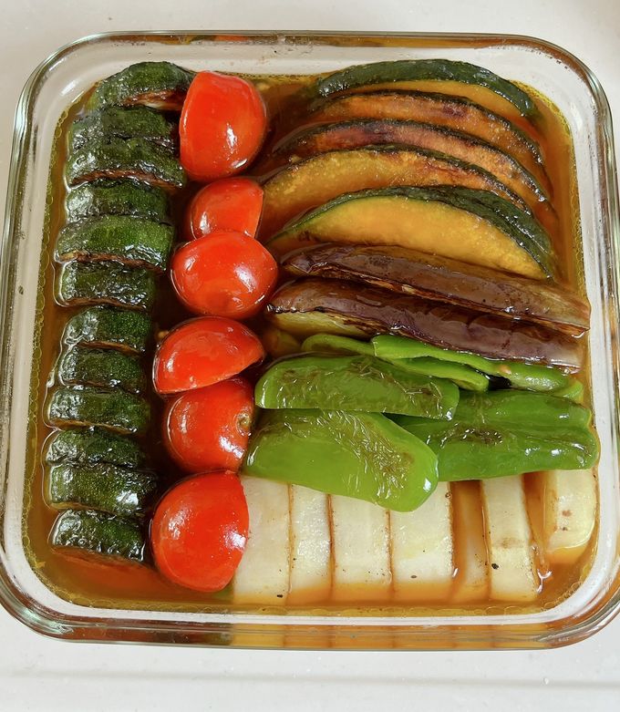 一藤 on X: "見切り品コーナーで投げ売りされてる夏野菜を大人買いするやん。フライパンで焼き目が付くまで焼くやん。麺つゆとお酢を1:1で混ぜた漬けダレに放り込むやん。これが胃が疲弊し気味な大人の夏にぴったりの、鮮やかさっぱりうまうまご飯ってやつなんですよ。