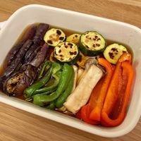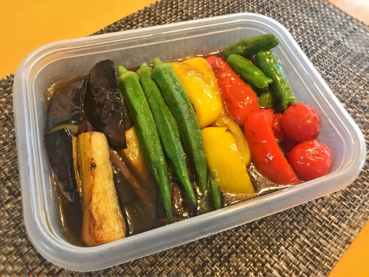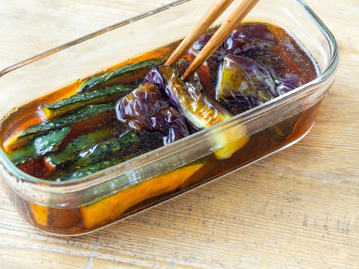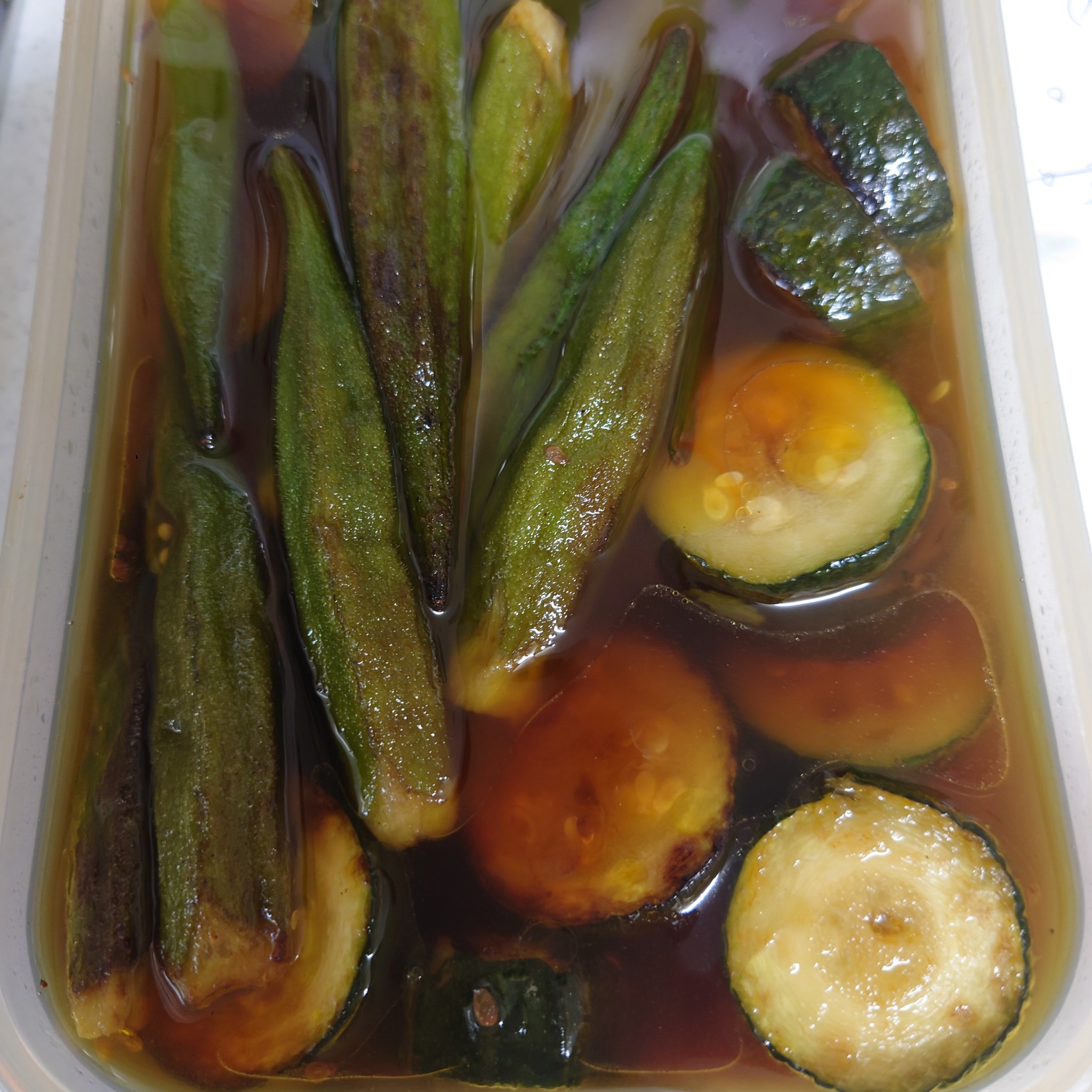 一藤 on X: "見切り品コーナーで投げ売りされてる夏野菜を大人買いするやん。フライパンで焼き目が付くまで焼くやん。麺つゆとお酢を1:1で混ぜた漬けダレに放り込むやん。これが胃が疲弊し気味な大人の夏にぴったりの、鮮やかさっぱりうまうまご飯ってやつなんですよ。