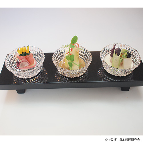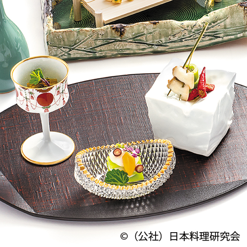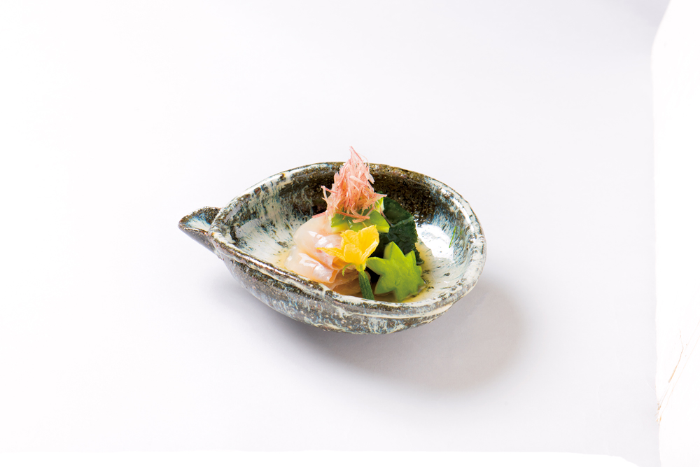 永朋舎 - 先八寸 蓮の葉盛鱧、胡瓜、酢取り茗荷子、夏菊、花丸胡瓜、喰酢 高岡寿康Facebook。