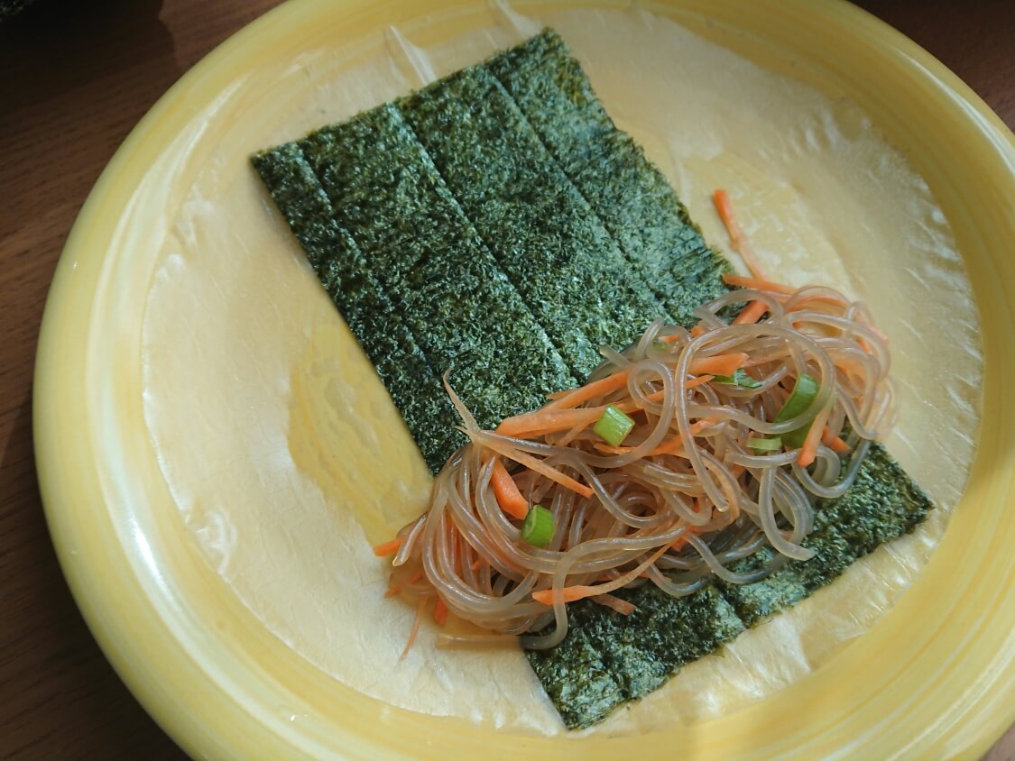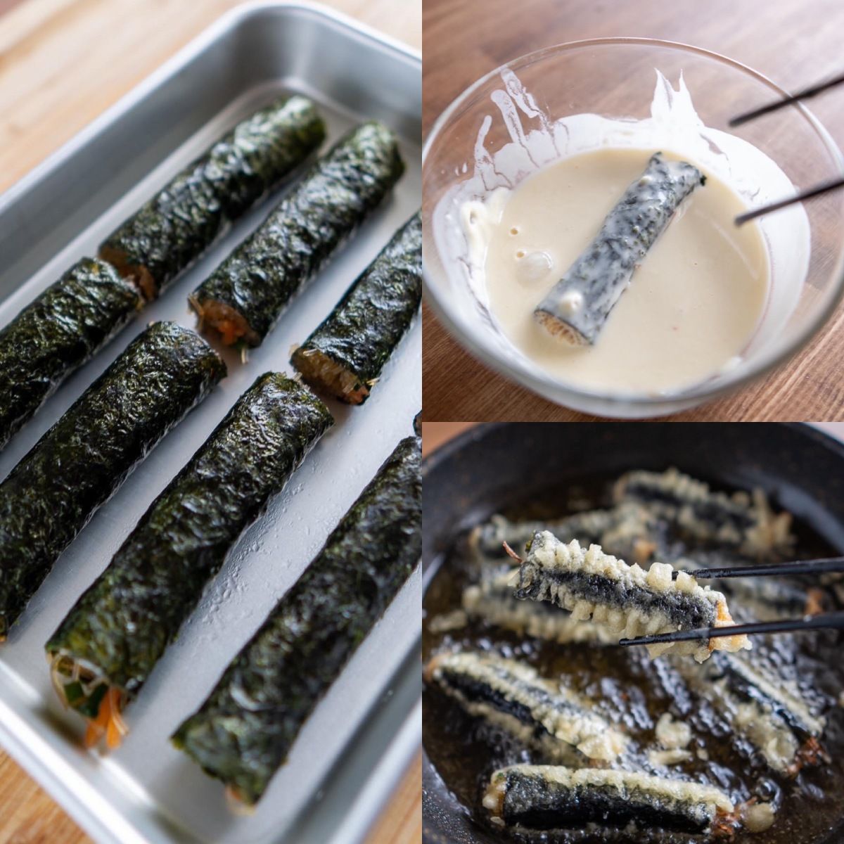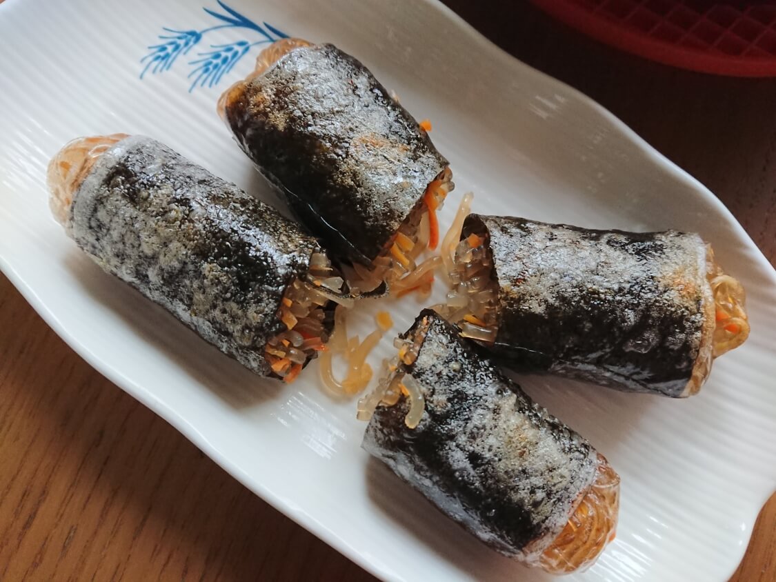 春雨の海苔巻き揚げ キムマリ の韓国人気レシピ。ライスペーパーで新食感!カライチ。