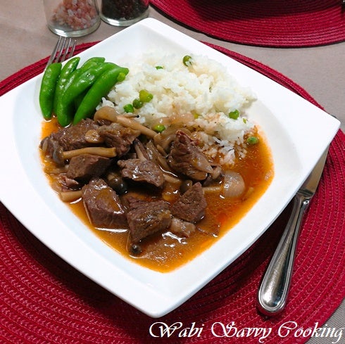 硬い肉を赤ワインでやわらかく!~ブフブルギニョン with 豆ごはん~和美Savvy Cooking。
