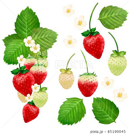 美味しそうなイチゴと葉っぱと花のイラストセット素材のイラスト素材85190045- PIXTA。