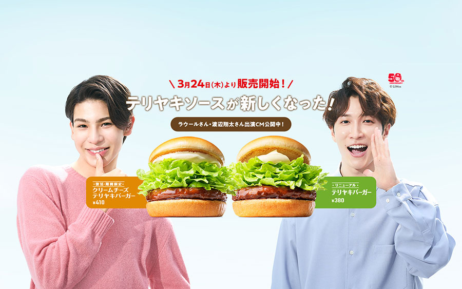 Snow Manラウール&渡辺翔太、モスバーガー2022年イメージキャラクター就任、テレビCM「なにが変わった?」篇出演、新テリヤキバーガーに「ん!うまっ!」2022年3月16日- エキサイトニュース。