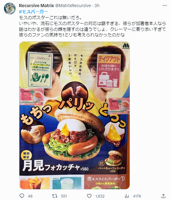 モスバーガー on X: " お詫び モスバーガー店舗の掲示物について本日発表したジャニーズ事務所所属タレントの起用方針にもとづき、店頭広告等への対応を行っていたところ、特定の店舗において、店頭掲示物に不適切な加工がされている事実を確認いたしました。https。