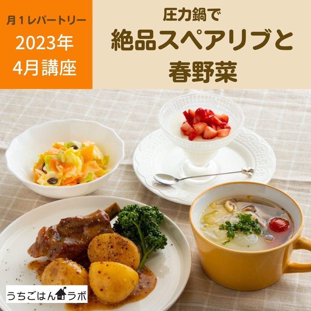 圧力鍋で、絶品スペアリブと、, 春野菜を楽しもう!💕, , 圧力鍋のお料理教室, うちごはんラボ, , 春野菜がおいしい季節。,圧力鍋で味わいましょう!, , , 🌟圧力鍋でスペアリブと新じゃがの, ハニーマスタード, , 🌟圧力鍋で新玉ねぎのシンプルスープ, ,・春キャベツのフルーティサラダ, ・ミルクゼリーフレッシュいちごソース, ・ごはん, , 🌟マークのお料理は,。