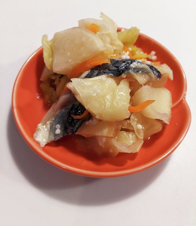 ニシン漬け」 たくあん、菊芋の糠漬け、赤 かぶのぬか漬け、みょうがの梅酢漬け、まめ漬け、大根の葉くるみ 漬けなどなど 青森では漬け物がとっても豊富です昔から冬の間の保存食の役割で 食べられてきた伝統食でもあります。 そんな漬け物の中でも 大好きなのが この。