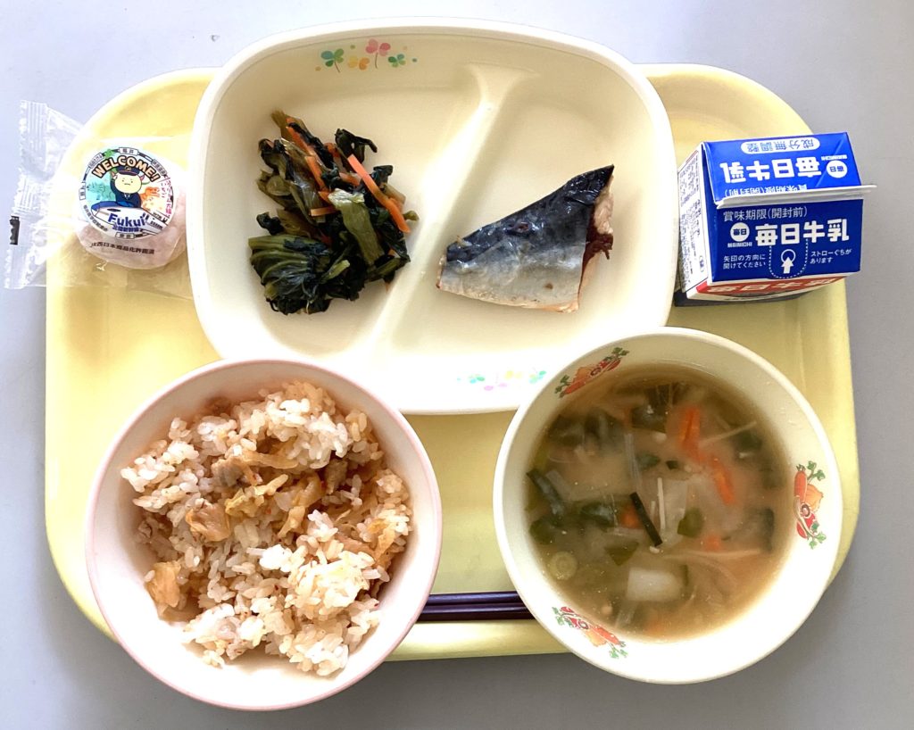 献立~ ・キムタクごはん ・ワンタンスープ ・ヨーグルト ・牛乳 キムチとたくあんを使った子どもたちに大人気のメニュー「キムタクごはん」🍚1月29日に西部市民センターで行う給食試食会のメニューにもなっています☺ ぜひ味わってみてくだいね✨福山市学校給食。