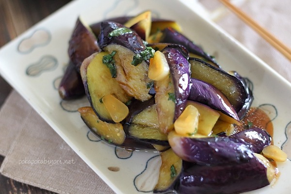 なす大量消費 なすだけ!「揚げない」揚げなすのにんにく醤油。