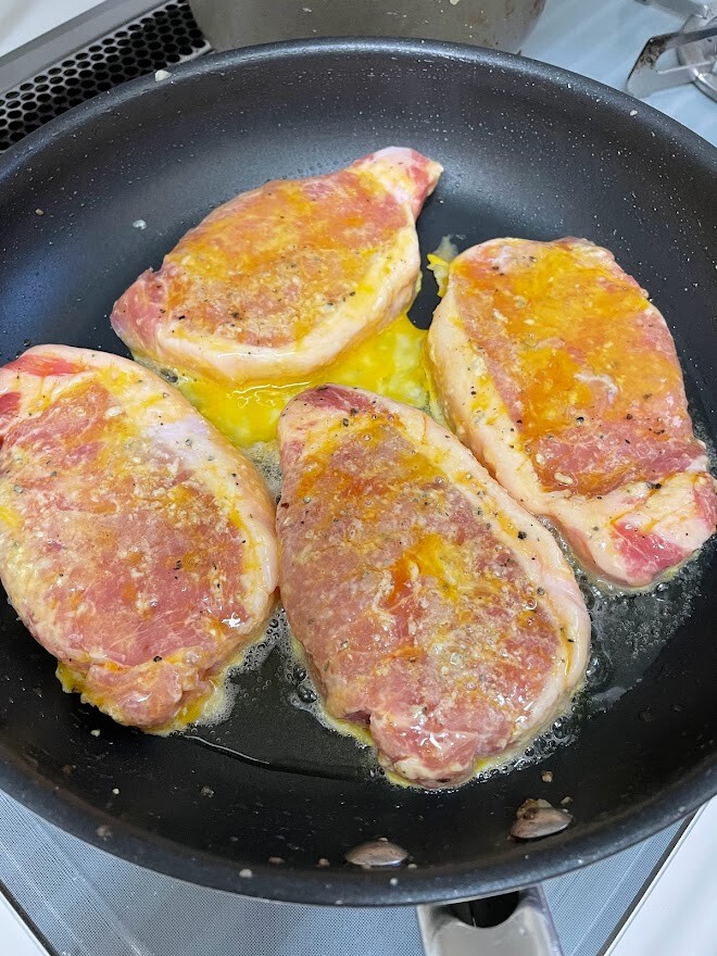 漬けて焼くだけ!『ハニーマスタードしょうゆのポークステーキ』。