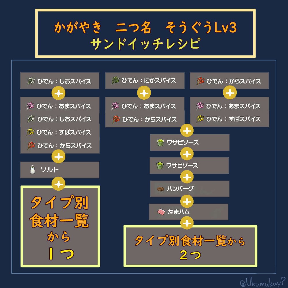 だぴお on X: "しおスパイスを使わず全タイプに対応した、かがやきパワー・そうぐうパワーLv3色違い厳選用のサンドイッチレシピ出来ました!ポケモンSV https:t.co riwA3MMLpz"X。
