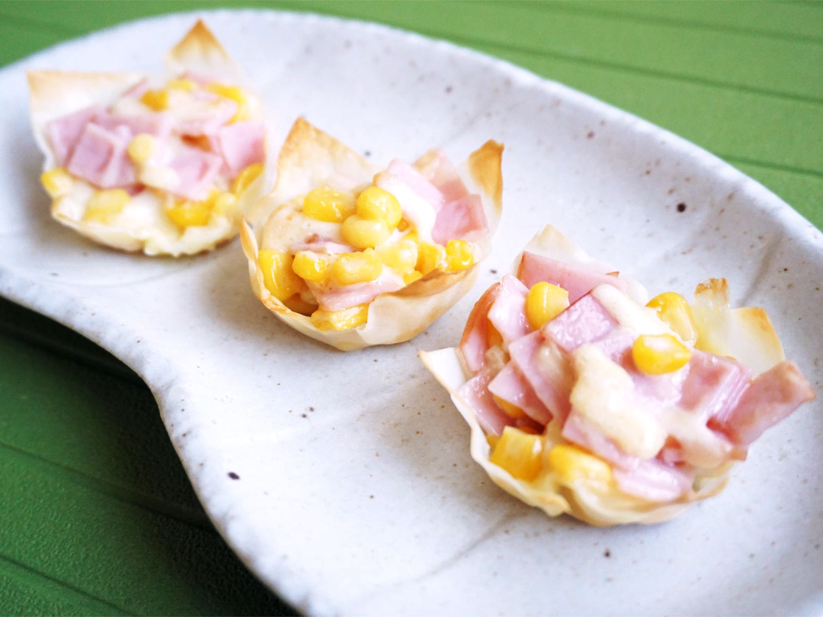 シュウマイの皮で!コーンとハムのミニカップグラタン。