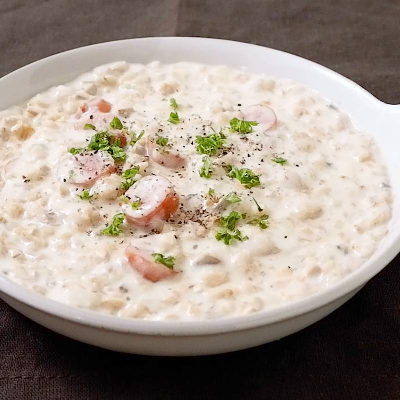 レンジで作るカルボナーラ風豆乳オートミールリゾット豆乳レシピマルサンアイのお料理レシピマルサンアイ株式会社。