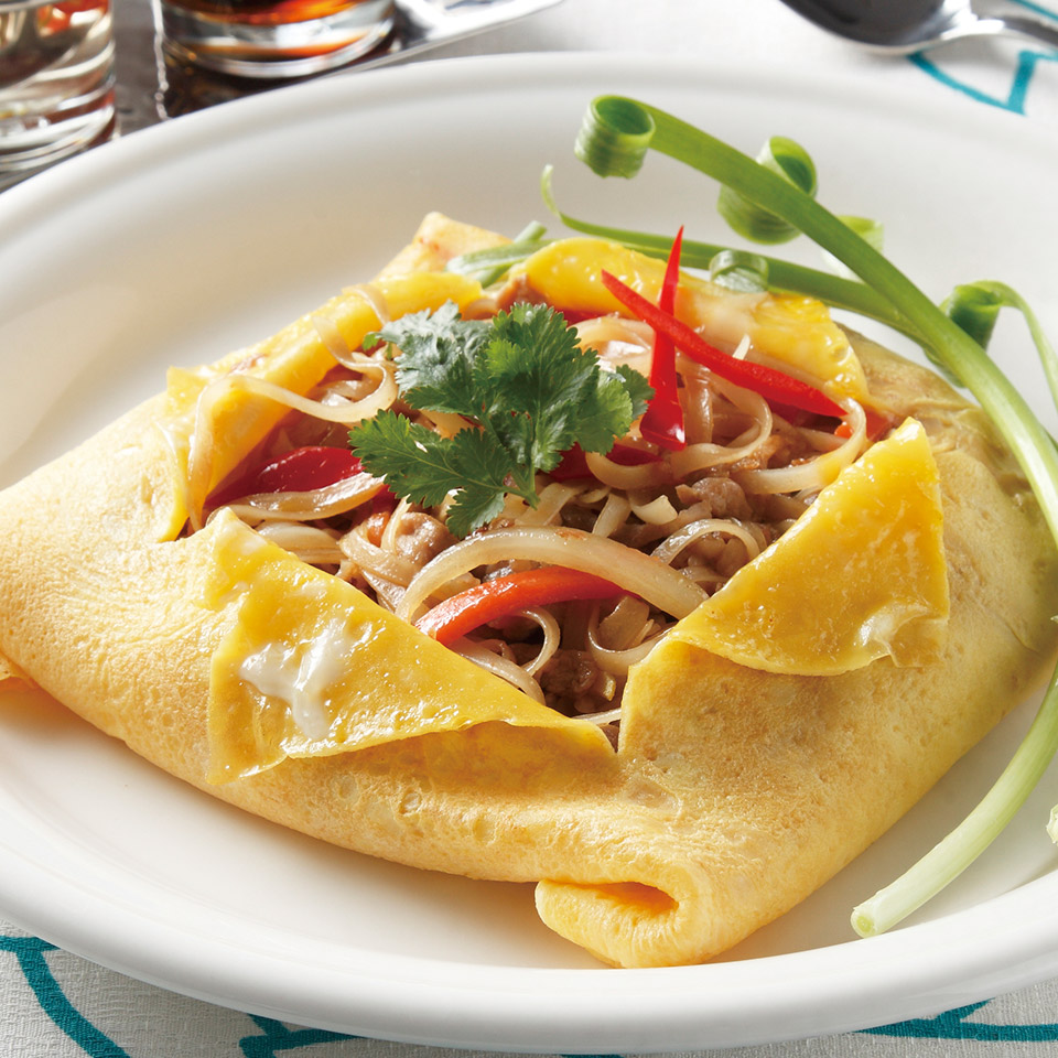 タイ焼そばの卵包みタイフードを使ったアレンジレシピタイフードヤマモリ。