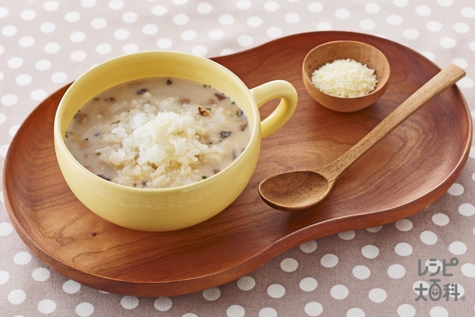 きのこ de チーズリゾット の献立 副菜:ベーコンの野菜巻き、主菜:たっぷり野菜のかぼちゃシチュー 献立・メニュー 味の素パーク たべる楽しさを、もっと。