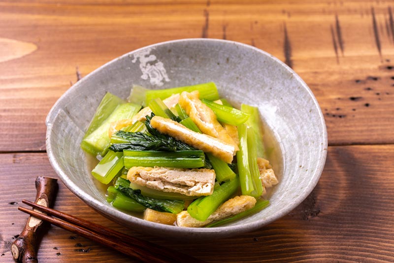 簡単和食おかず!作り置きにぴったりで茎まで味しみ!小松菜と油揚げの煮びたしの作り方。