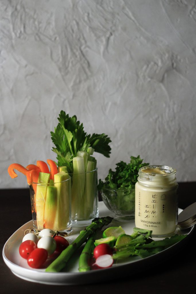 おしゃれマヨネーズを添えた簡単野菜プレートの盛り付け。