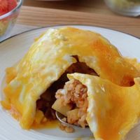 簡単オムライス、トマトのメキシカンサラダ、新じゃがとハムのスープ 2人分。
