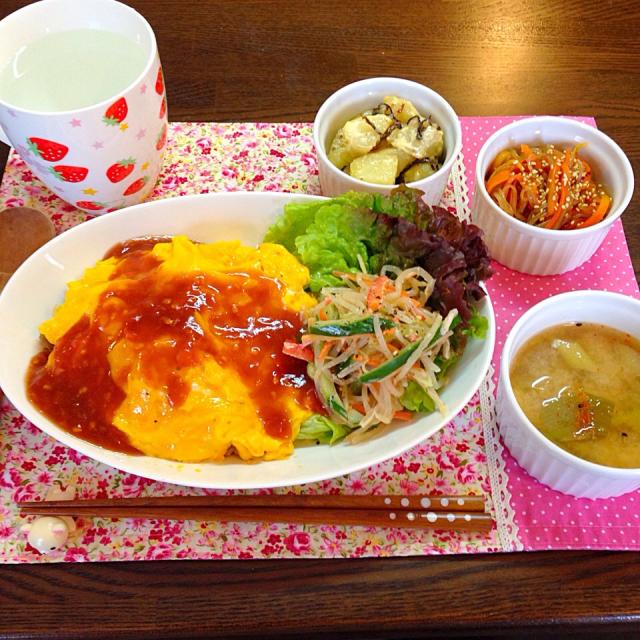オムライス しらたきとにんじんのきんぴら じゃがいものマヨ塩こんぶ 付け合わせサラダ お味噌汁 にゅきSnapdish スナップディッシュID:THXiaa。