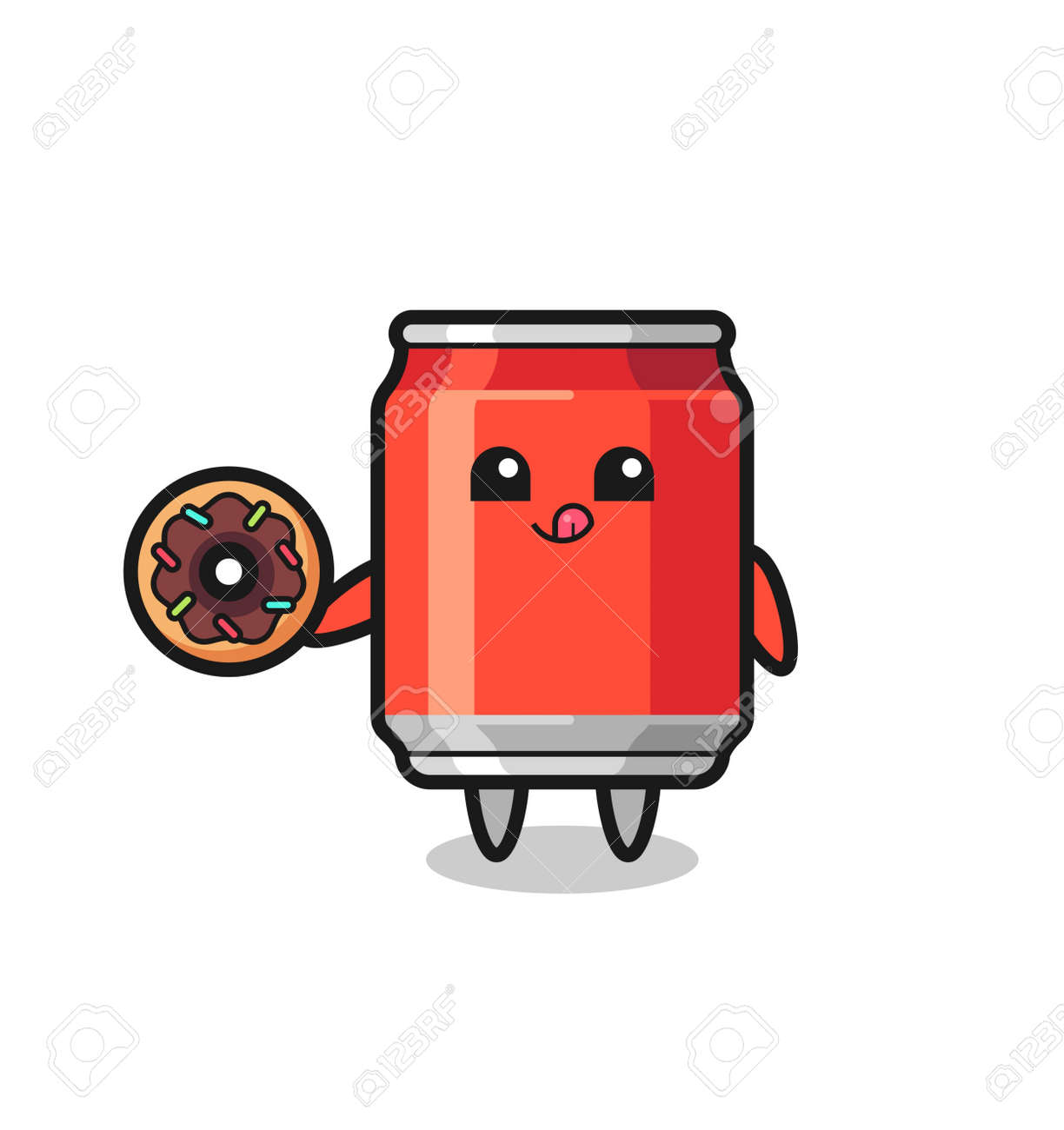 ドーナツを食べる飲み物缶キャラクターのイラスト、Tシャツ、ステッカー、ロゴ要素のかわいいスタイルのデザインのイラスト素材・ベクター Image174072593。
