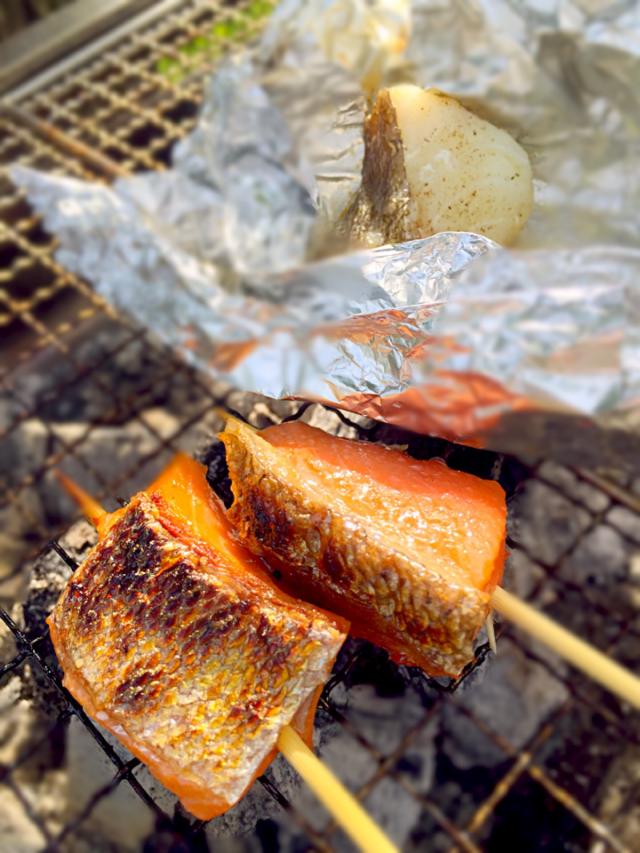 BBQ 本日のメインは鮭のハラスの串刺しに鱈のホイル焼き TomySnapdish スナップディッシュID:LbG1fa。