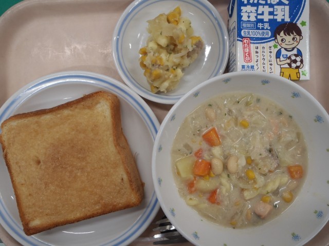 1月30日 木普通食ココアマーブル食パン 牛乳 プーティン カナダ風フライドポテト肉団子とかぶのスープ キャベツとコーンのサラダ食物アレルギー対応食米粉パン 代替食飲用豆乳 代替食プーティン カナダ風フライドポテト除去食肉団子と。