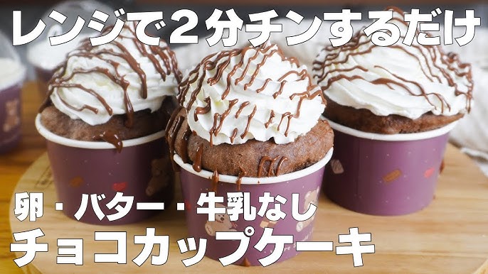 材料4つ レンジで2分!チョコカップケーキ作り方!, 材料 , ◯チョコカップケーキ, ・ホットケーキミックス150g,・スーパーカップチョコ1個, ・絞るだけホイップ1個, ・チョコレート50g,1.チョコアイスを細かく割り、500wの電子レンジで2分加熱して溶かす。, 2.ホットケーキミックスを入れて混ぜる。, 3.カップに流し入れる。,4.500wの電子レンジで2分加熱する。,。