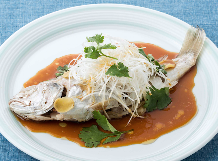 重慶飯店本館の季節料理 「魚の姿蒸し ピリ辛発酵ソース」 中国の正月に欠かせない「年年有魚」。紅白もめでたいアカハタの姿煮に、自家製発酵唐辛子と高菜ベースの濃厚で酸味のあるピリ辛ソー スをたっぷり。淡白な白身魚の旨みが引き立つお祝い料理です。重慶飯店。