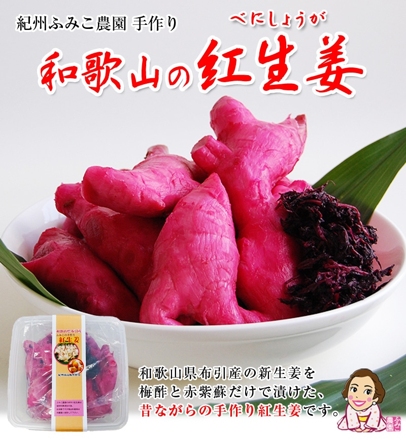 紀州ふみこの紅生姜600g固形500g 和歌山県産の新生姜だけを使用した手作り紅しょうが保存料、着色料無添加の国産 手作り 紅 ショウガ 送料無料無添加あんぽ柿や梅うどん、お得な梅干し、野菜にフルーツ、ハローキティ立体ケーキの紀州グルメ専門店 ふみこ農園。