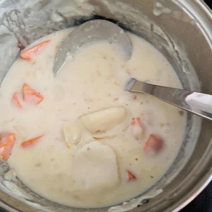 冷凍シーフードミックスと冷凍野菜のクリームシチュ。