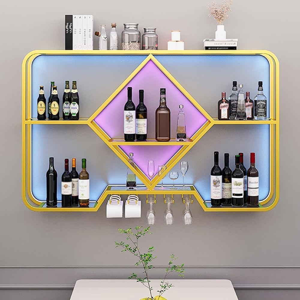 LEDライト付き壁掛けワインラック、ガラスホルダー付き多機能機能ストレージワインストレージディスプレイラック、ホームレストラン用バー Amazon木製 お酒収納ラックLEDライト付き,多機能ワイン収納ディスプレイラック,ワインバーキャビネットワイングラスホルダー。