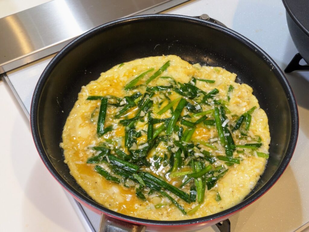 リュウジさんの「至高超えのニラ玉」に挑戦♪ニラを軽く炒めたら卵液に加えるのがコツ!シャキシャキ!『あたらしい日日』こんな時代のニューノーマルな暮らし方。食と農、生活情報をお届けします。